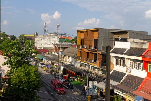 Fluffy clouds hung in the sky. The twin peaks of Doi Pui and Doi Suthep rose in the distance. A local temple right below had a brick building dating back ages. The afternoon sun cast rays down upon the scene.