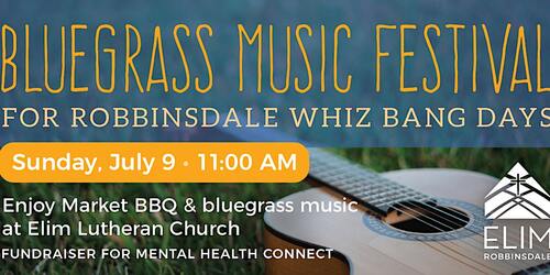 Elim Lutheran Church is hosting a Bluegrass Music Festival and Fundraiser with all proceeds going to Mental Health Connect. All ages are welcome. You are all invited to attend this event before the Robbinsdale Whiz Bang Days parade. This is a free family event with music, a food truck, raffles, and games– all ages are invited to join in the fun. Come, listen to Bluegrass music, eat, and learn more about Mental Health Connect.