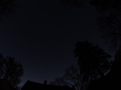 Last night was the peak of the Geminids, a prolific meteor shower often ignored due to falling on cold December nights, as opposed to the popular Perseids which happen on the warm evenings of August. Still, with the skies clear, I was outside with my camera. Even though the photo above is the best shot I got, I was able to see many more with my eyes.