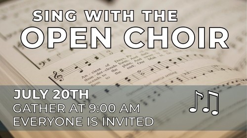 Everyone is invited to sing in the Open Choir for the July 20th service. We will meet at 9am that Sunday to warm up, run hymns, and learn an anthem based on a well-known hymn. If you are interested in participating, contact Meg or come at 9am that morning ready to sing.
