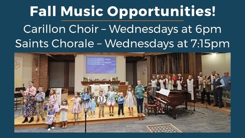 This fall, you are invited to help lead and enliven Sunday worship. Saints Chorale rehearsals are on Wednesdays at 7:15pm and begin September 3rd. Carillon Choir rehearses Wednesdays at 6pm and begins on September 10th. Find more information on adult music opportunities and sign up here.